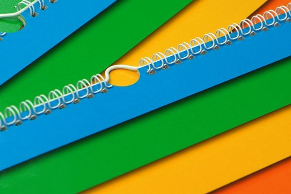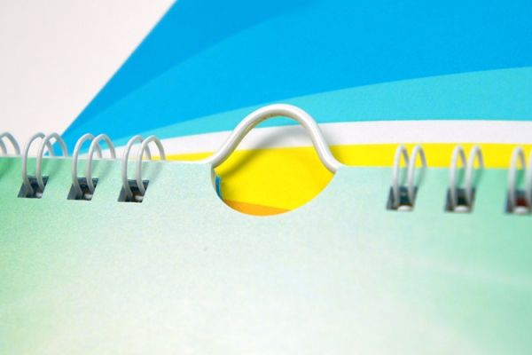 - Переплет при помощи металлической пружины с ригелем для подвески на стену.